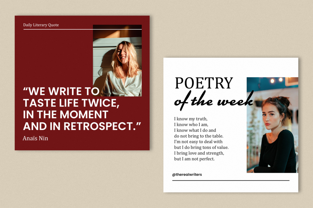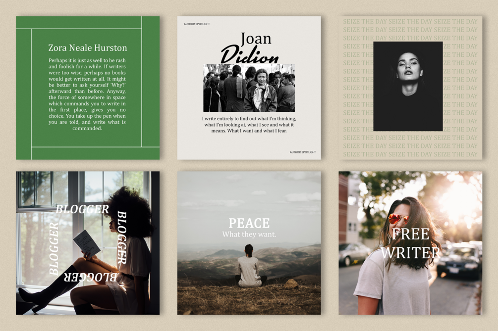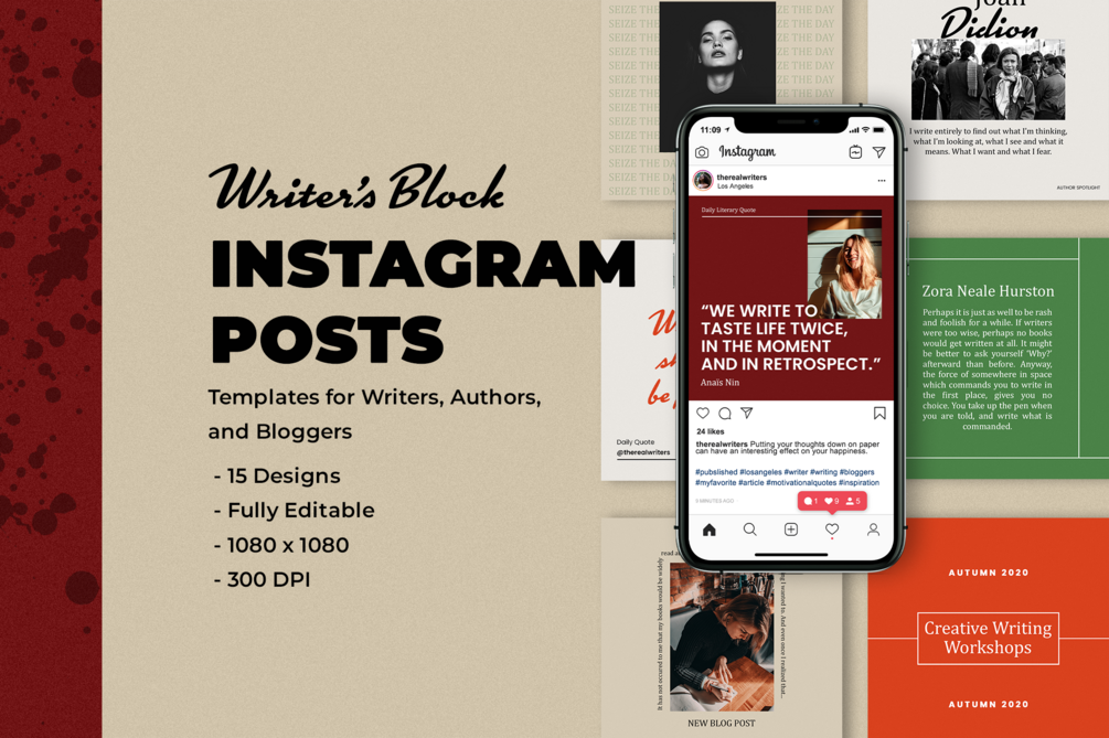 Instagram Post Pack for authors, writers, and bloggers. Includes 15 editable design variation templates for social media accounts and publications. These templates are suitable for promotional purposes on your Instagram stories and easy to modify using Adobe Photoshop.
